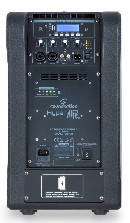 Soundsation HYPERUP 8BA, si tratta di un sistema audio portatile (poco più di 13kg in totale) a colonna, alimentato a batteria o a corrente, con subwoofer ad alta escursione da 8” e array verticale composto da 4 altoparlanti da 2.5” full-range pilotati da finali in classe-D da 600W di picco e processamento digitale per il controllo totale sia dei trasduttori, del limiter multibanda, delle protezioni e della risposta in frequenza.